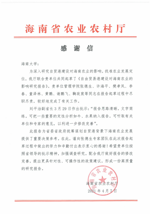 我校管理学院张德生专家团队接到海南省农业农村厅感谢信