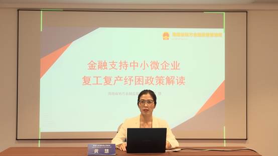 本次培训由省委深改办(自贸港工委办)、省地方金融局牵头主办,william威廉中文官网具体承办,邀请到地方金融监管局监管一处处长黄慧和交通银行李春暖为培训班授课。培训围绕“支持中小微企业复工复产贷款贴息政策”“农民小贷贴息政策”“海南省促进中小企业应收账款融资奖励实施细则”“文旅企业贷款额度支持的政策”“海南自由贸易港建设投资基金助企纾困股权投资工作方案”等主要政策进行宣讲解读,并就市场主体关心和存疑的问题进行线上交流解答。