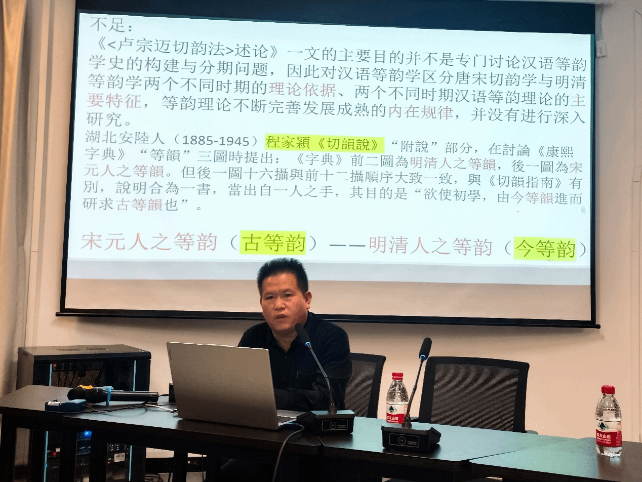 在讲座中,李军教授对汉语等韵学的学科特征进行了简要介绍。他指出,汉语等韵学是中国传统的汉语音系学,是具有中国特色的古典音系学,是理论最完善、研究方法最独特,最具原创精神和理论思辨体系的传统学科之一。目前学术界对汉语等韵学的研究虽然取得了比较丰硕的成果,但还缺乏对这门学科的理论发展史、学术发展史进行比较深入系统的研究。讲座在对前人有关汉语等韵学史分期的观点进行评述的基础上,提出了新的看法。认为根据汉语等韵学理论的发展特征与内部规律,汉语等韵学可以分为:(1)萌芽发展期——唐五代前期切韵学;(2)成熟期 ——宋元切韵学;(3)转型期——金元等韵化韵书编撰;(4)繁荣期——明清等韵学、明清切韵学;(5)鼎盛期——清代切音学;(6)式微期——清末民初切字学。在此基础上,对宋元切韵学理论的发展过程进行了简单梳理,对切韵图的两种传统读法——横轮法(贯珠法)、直下法(卷帘法)进行了介绍。